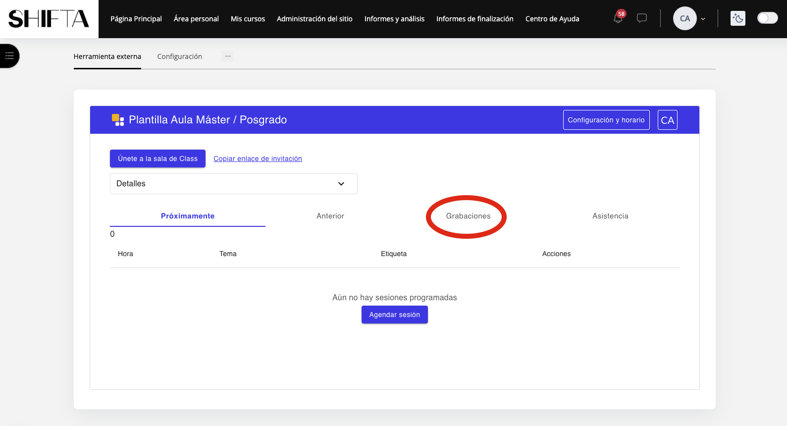 The recordings of live sessions are created and stored through the Videoconference Room tool. This tool is located within each course’s virtual classroom. To access the recordings, follow the steps outlined below: